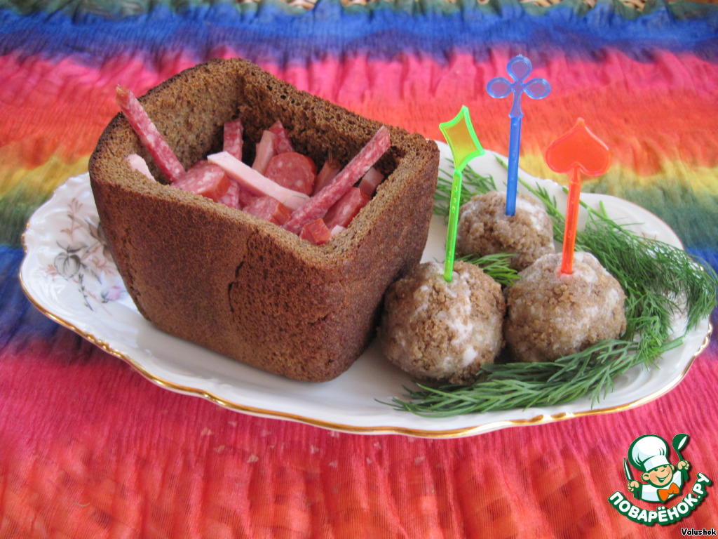 Сложите мясное ассорти в хлебный горшочек.