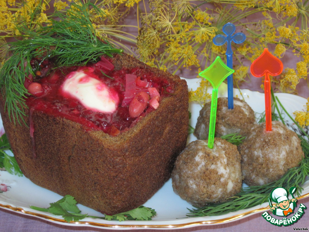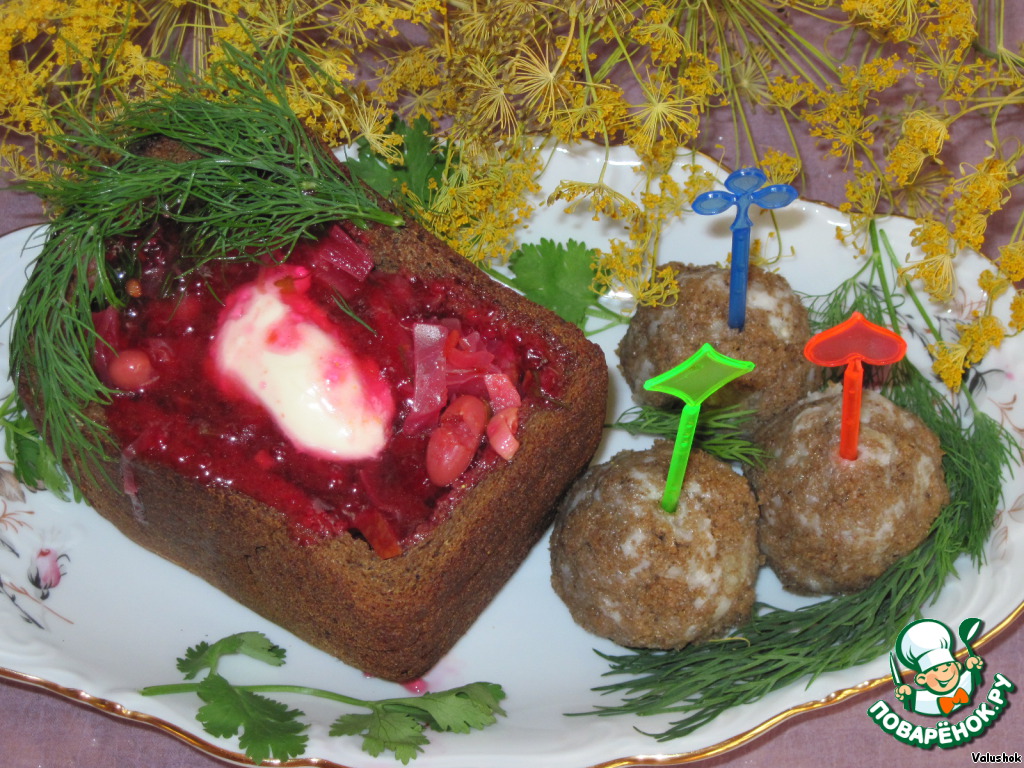 | Когда мне на глаза попался этот рецепт, сразу возникло желание приготовить его для конкурса. Заинтересовал он меня своим оригинальным способом подачи. Рекомендуется для поездки на природу. Заранее подсушите буханочки хлеба, сварите постный борщ, нарежьте мясное ассорти и получите удовольствие от приема пищи в необычных горшочках из хлеба. Остатки хлебных чашек запеките на костре и похрустите корочками. Для тех же, кому чашек не достанется, налейте борщ в тарелочки и предложите пампушки из хлебного мякиша. Бон аппетит! |
