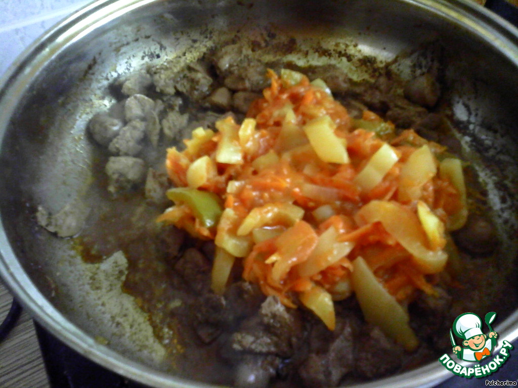 К сердечкам добавить соевый соус, через 2 - 3 минутки добавить лечо. У меня было домашнего изготовления: морковь, сладкий болгарский перец, томаты, растительное масло, специи. Если покупное - не страшно, главное без большого количества "глютаматов" и специй - чтобы вкус не перебить. Если и этого нет - просто отдельно потушите эти овощи и добавьте к сердечкам с печенкой. Туда же 1 - 2 столовых ложки томатной пасты. Перемешать, потушить 2 минутки.