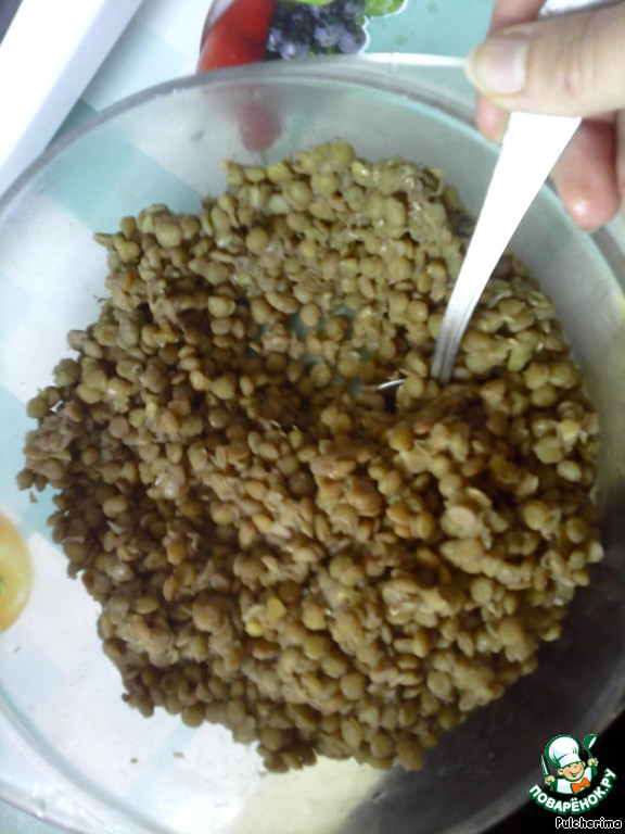 Чечевицу зеленую отварить до полуготовности. Я для ускорения процесса пользуюсь микроволновкой: залила водичкой, поставила на 20 минут и "забыла"!
