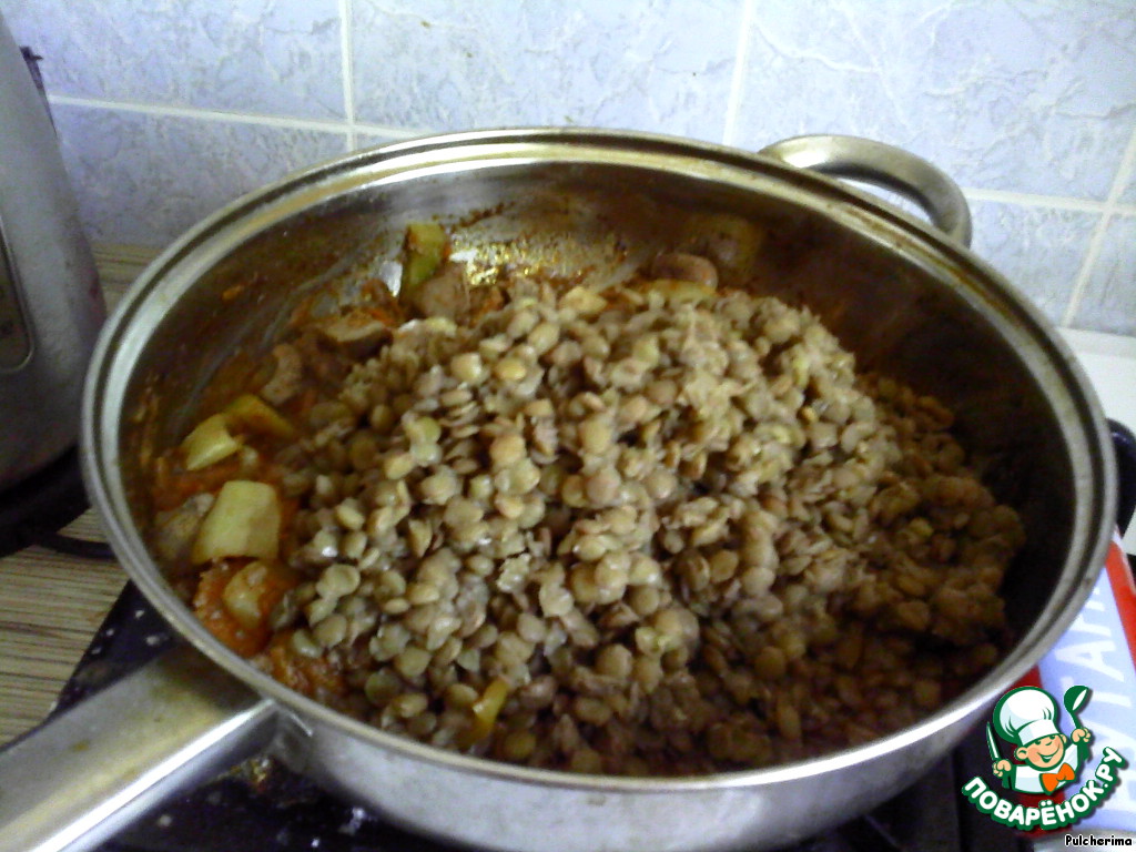 Следом выложить отварную чечевицу. Хорошенько перемешать. Если очень густо - добавить полстакана водички. Если соевого соуса недостаточно - подсолите немного. Также туда добавляем 1 чайную ложку жидкого дыма - он очень хорошо дополнит блюдо ароматом копчения! Потушите еще минут 5 - и готово!