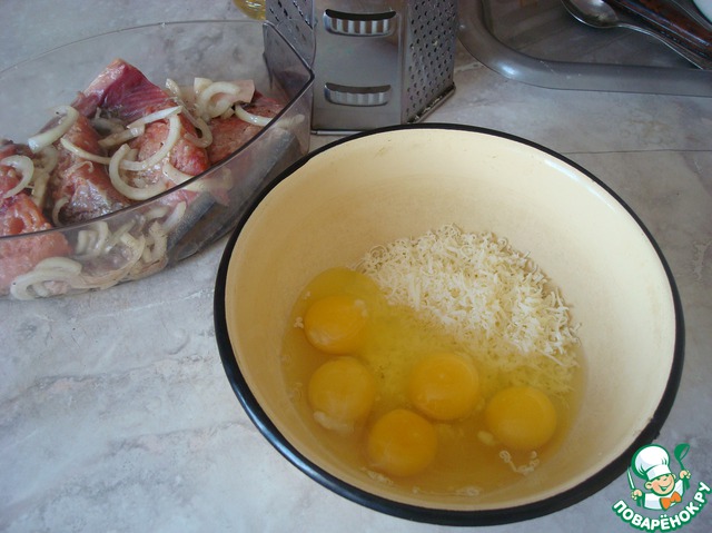 Пока рыба маринуется, готовим смесь для омлета. Натираем сыр на мелкой тёрке, добавляем яйца, соль, перец и взбиваем.