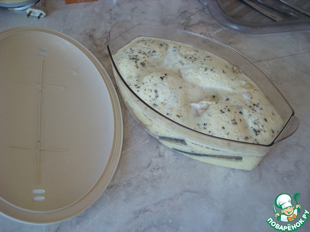Рыбу заливаем смесью для омлета.