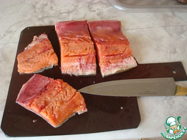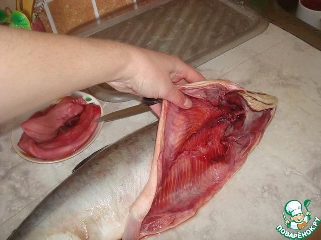 Горбушу почистить от чешуи, выпотрошить внутренности, обрезать голову и хвост для ухи, разрезать тушку на 2 части вдоль. Oдна половинка пойдёт на засолку, а из второй необходимо удалить кости.