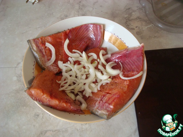 Уложить рыбу в тарелку, добавить порезанный полукольцами лук.