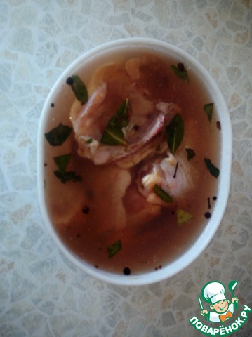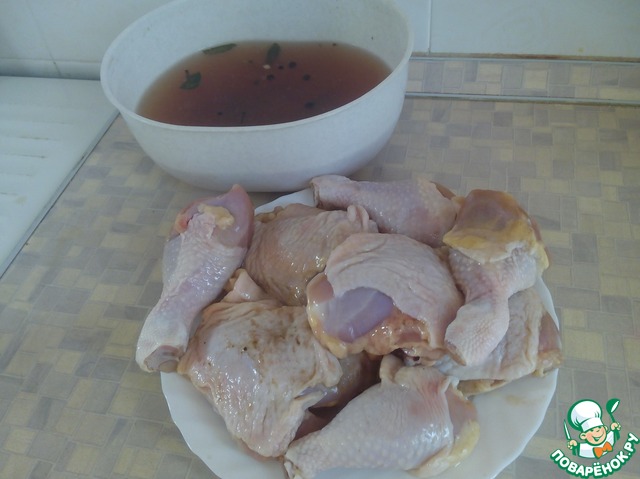 Готовим маринад.1 л воды вскипятить смешать с 1 ст. л. соли, 0,5 сахара, лавровым листом, перцом душистым, перцом чёрным, кориандром и корицей. Замариновать окорочка и оставить в холодильнике на 4-5 часов.