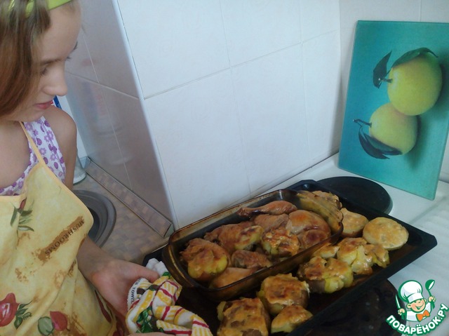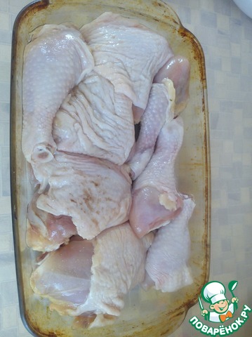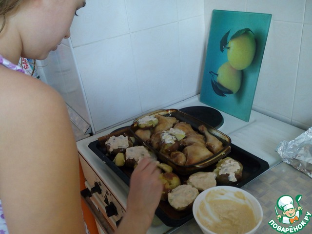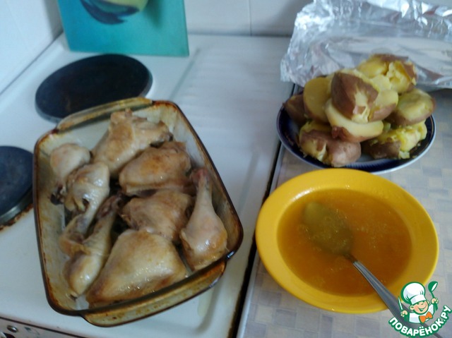 От курочки выделился сок. Этим соком мы смазываем окорочка и картошечку ( кладём её рядом на противень).