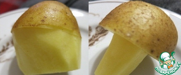 Приступаем к метаморфозам: срезаем немного одну сторону картошки (это будет низ), подрезаем границы будущей шапочки и очищаем кожуру с будущей ножки нашего гриба, формируем гриб.