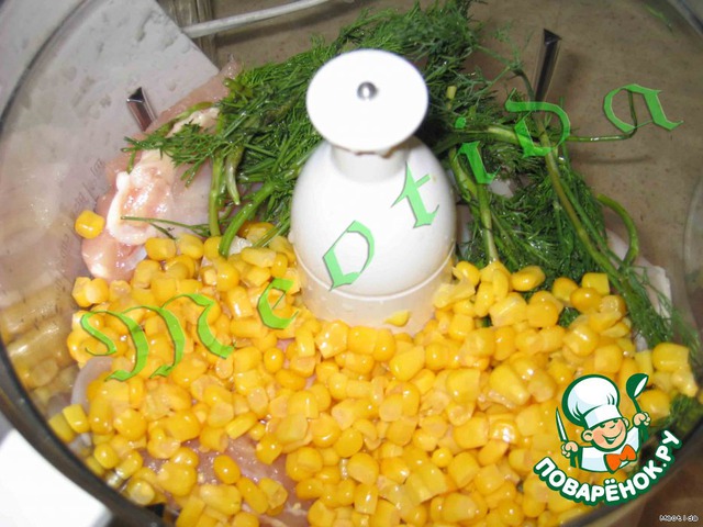Сделать однородный фарш из куриного филе, кукурузы (без сока), лука, зелени, сухарей, муки в кухонном комбайне или мясорубке. Приправить солью и перцем по вкусу.
