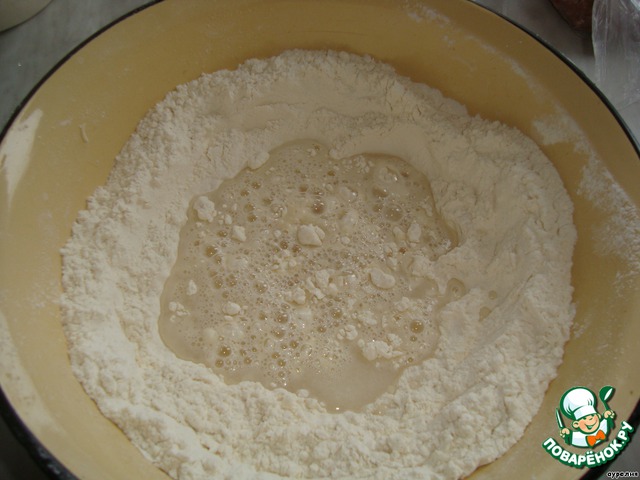 Муку просеять, сделать углубление, влить воду и добавить соль.
