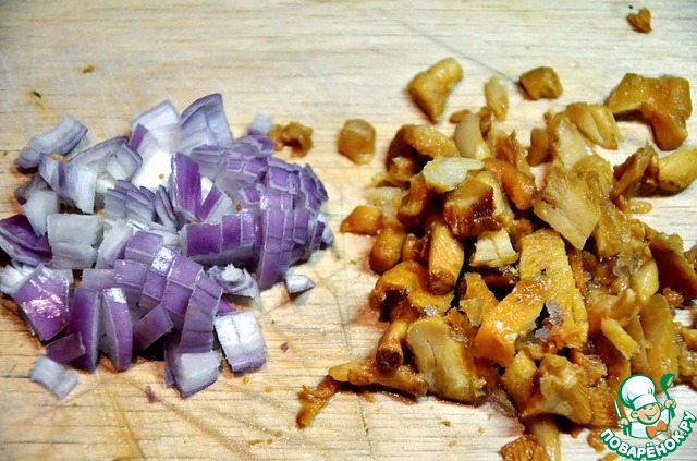 Обжариваем на сковороде с добавлением растительного масла куриную печень и оставшиеся крупно нарезанные грибы.