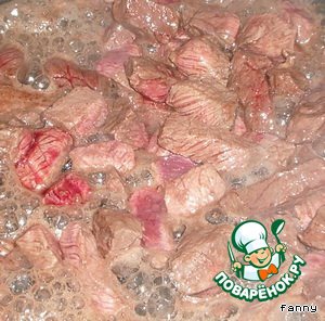 Мясо нарезать небольшими кусочками, поджарить на растительном масле, добавить муку.