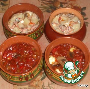 В 2 горшочка выложить: лук, морковь, чеснок, половину картошки, мясо, порезанные помидоры и перец, оставшуюся картошку.