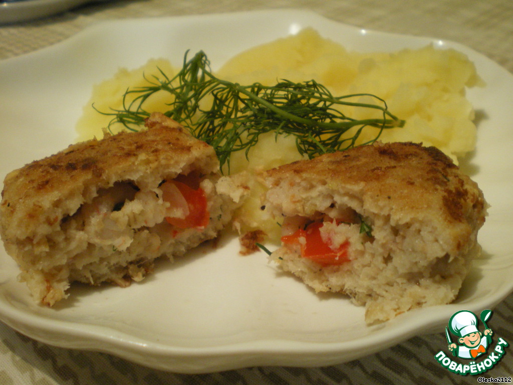 Из фарша делаем лепёшечки, в середину выкладываем начинку. Формируем котлетку. Обваливаем в панировочных сухарях и обжариваем на небольшом огне на растительном масле до готовности.