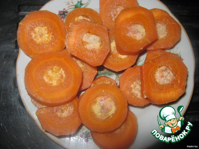 Нафаршировать морковь, нарезать ее кружочками (примерно по 2 см), смочить в яйце, обвалять в муке и обжарить с двух сторон на раст. масле.