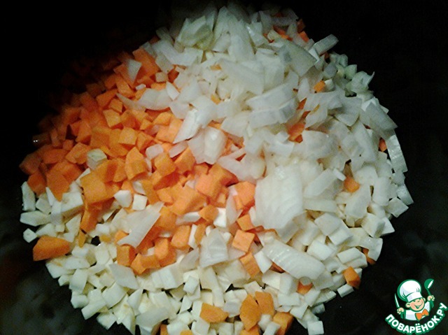 Овощи моем, чистим, мелко режем. Обжариваем в чаше мультиварки 10 минут в режиме "Жарка".