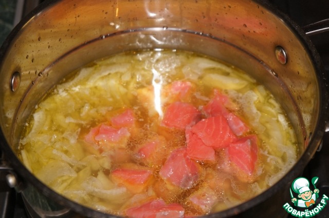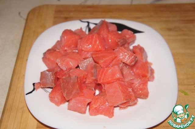 Семгу (кету или форель) разделать на филе и нарезать крупными кубиками.