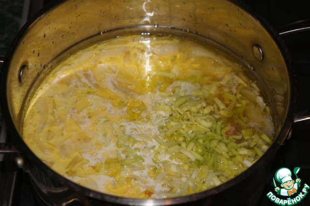 Подготовить продукты. Я позволила себе немного дополнить рецепт, чуть-чуть. В изначальном варианте лук отсутствует, но мой муж лук обожает, поэтому я добавила лук-порей. Возможен лук-шалот. Уточняю, что репчатый лук тут будет совсем неуместен, суп слишком нежный для него.
