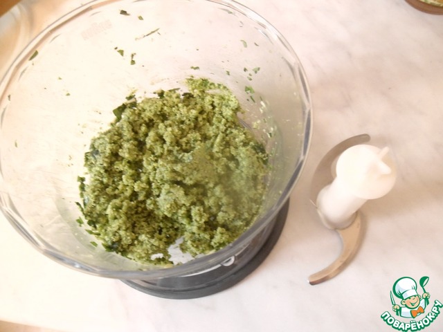 Измельчить в блендере листья базилика, 70 гр. сыра, чеснок, 1 ст. л. растительного масла.