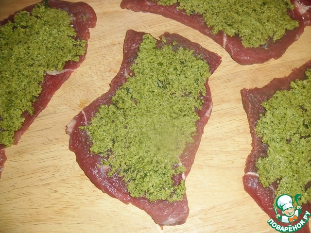 Я брала шинцели из говядины. Отбить каждый шницель между 2 слоями пленки. Посолить, поперчить с обеих сторон. Выложить на каждый начинку.
