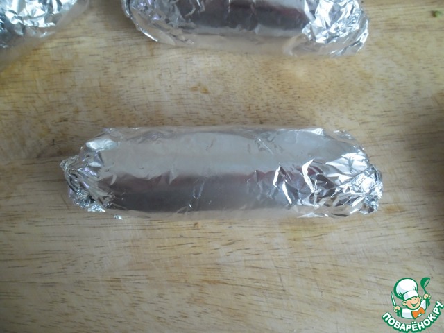 Свернуть в рулетики, закрепить зубочистками и слегка обжарить. А можно поступить иначе, тогда рулетики будут поровнее (спасибо за идею Танечке hto33). Свернуть шницели в рулетики, а затем, не скрепляя зубочистками, положить на лист фольги и свернуть "конфеткой".