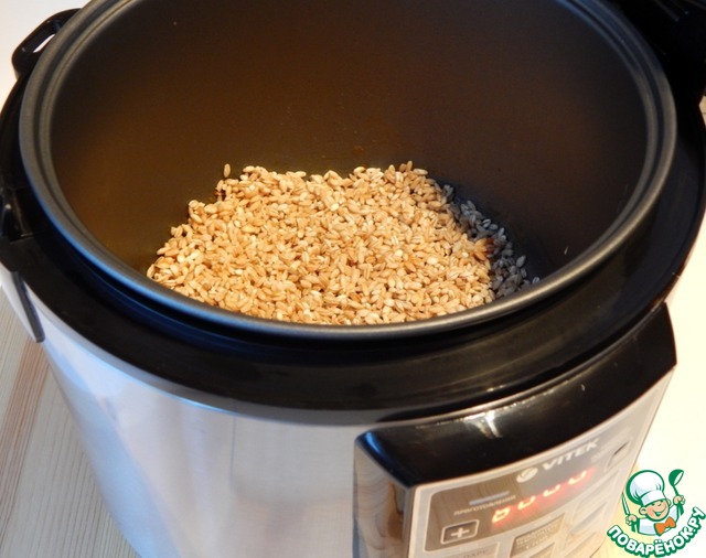 Добавить в чашу перловку и готовить ещё 5 мин.