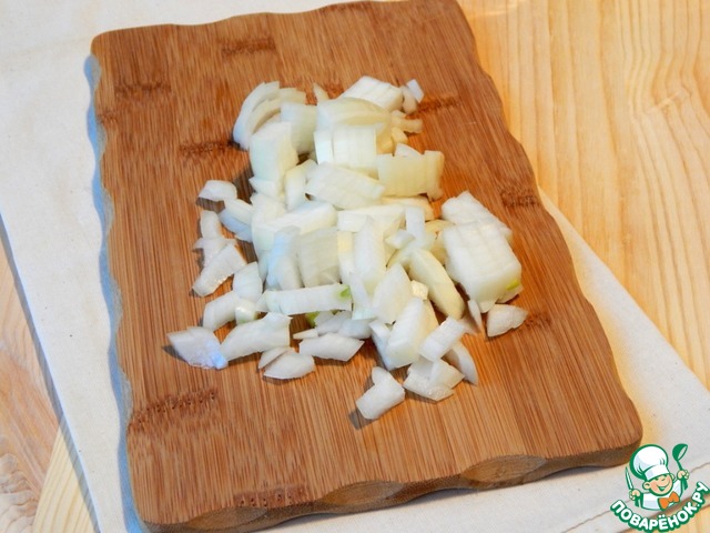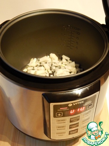 Разогреть в мультиварке на режиме "Мультиповар" при температуре 140гр оставшееся масло и обжарить на нем лук в течении 5 мин.
