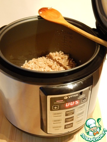 Влить бульон или воду (3,5ст) и готовить в режиме "Мультиповар" при температуре 150гр 30 мин.