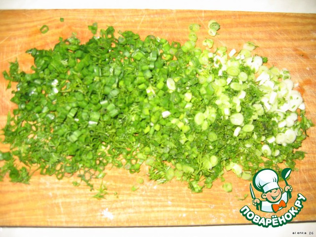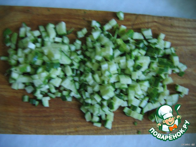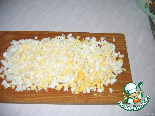 Покрошить свареные вкрутую яйца. По традиционному рецепту яйца надо порезать на 6 частей, но я люблю помельче.