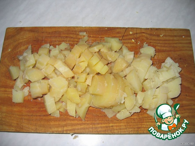 К этому времени картофель уже сварился, охладить его, очистить от кожуры и тоже порезать кубиками. Можно картофель есть с супом вприкуску.