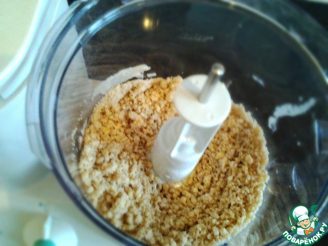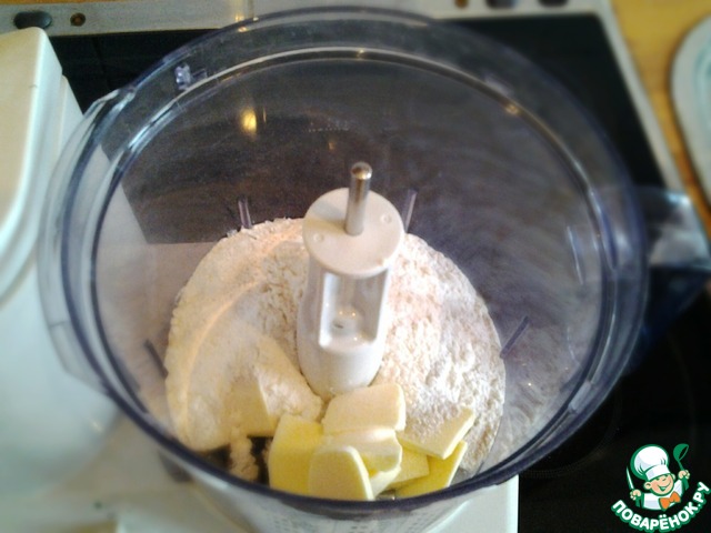 Оба вида муки ( пшеничную и пшеничную цельнозерновую), соль и нарезанное на кусочки масло помещаем в чашу миксера с ножевой насадкой. Рубим на средней скорости в крошку.