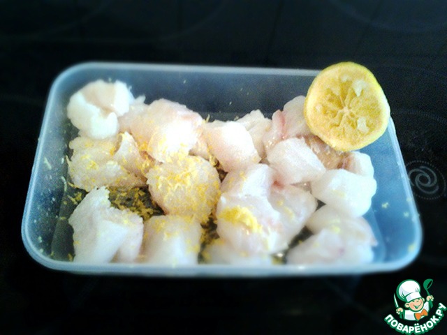 Тем временем рыбу моем, режем небольшими кусками (2 на 3 см) и добавляем к ней сок и цедру 1/3 лимона. Овощи моем, брокколи разделяем на маленькие соцветия, 1/4 болгарского перца режем короткими полосками. В высокой узкой емкости погружным блендером взбиваем яйца, сметану, сливочный сыр ( типа "Филадельфии" или "Альметте") и зелень (я брала укроп и рукколу) до однородности. Добавляем соль, заливка должна быть чуть пересоленная, т. к. ни рыбу, ни брокколи мы не солили.