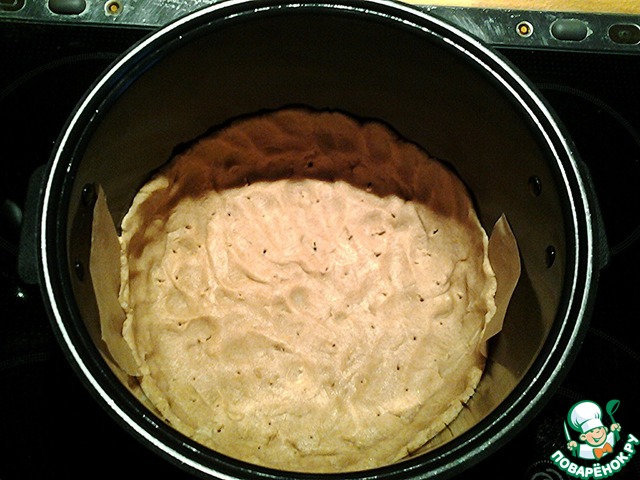 Бортики надо стараться сделать повыше, см. 4-5, т. к. тесто в процессе выпечки слегка осядет и начинка может перелиться через край. Накалываем дно пирога зубочисткой. Отправляем чашу в мультиварку, ставим время 30 минут, режим "Выпечка".