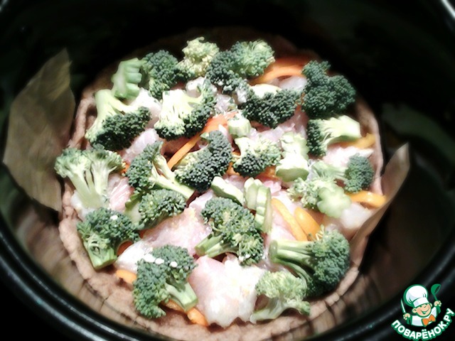 По истечении 30 минут вынимаем чашу из мультиварки, укладываем на тесто рыбу, сладкий перец и брокколи.