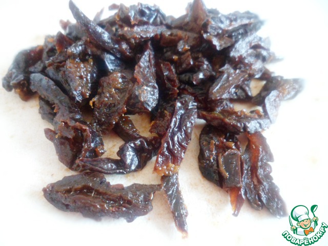 Огонь выключить. Горсть чернослива промыть хорошенько (если жесткий, заранее замочить в теплой воде). Нарезать мелкими полосками и добавить в соус.