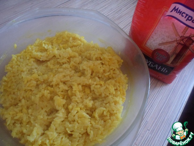 Итак, первым делом - гарнир! Рис у нас должен получиться пряным и желтеньким - это ж, в конце концов, китаец! В воду (2,5 стакана) добавить соевый соус, куркуму, корицу. Залить стакан риса и варить до готовности последнего. Я варю в микроволновке - чашка объемом 3 л, без крышки, 25 минут. Готовый рис слегка остудить.