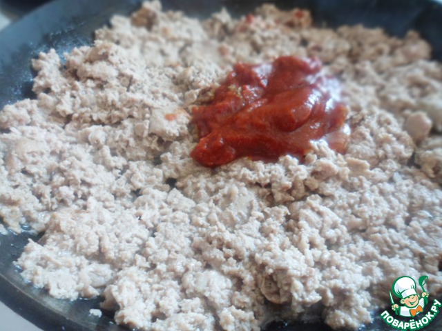 Размороженный куриный фарш обжарить на сухой сковороде, постоянно помешивая. Добавить 2 столовые ложки томатной пасты.
