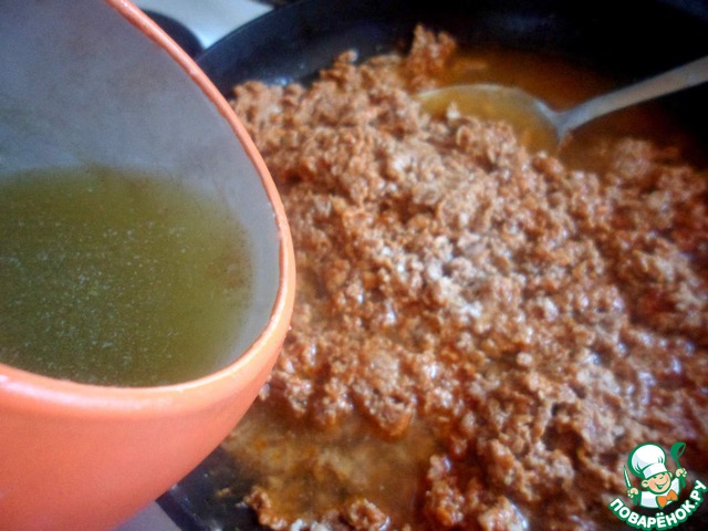 Далее - бульон. Вполне хватит полстакана, но все зависит от желаемой консистенции. У меня бульон был мясной.