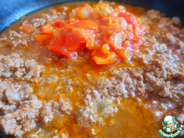 Теперь лечо. Сейчас в магазинах продаются очень неплохие соусы лечо. Я брала разные, главное - чтобы не сильно кислый и чтобы сладость болгарского перца явно чувствовалась. Но тут мне свезло: бабушка домашний передала. А т. к. с консервацией я пока не дружу, радуюсь бабушкиным заготовкам! В общем, добавляем 4 ст. л. с горкой лечо (не жалейте) к фаршу и тушим минуты 3.
