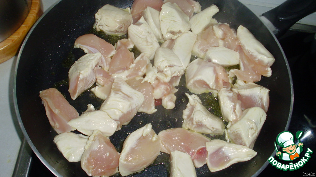 куриные грудки нарезать кубиками и обжарить на растительном масле