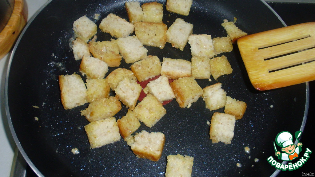 В это время: нарезать тостерный хлеб кубиками и обжарить его в сливочном масле