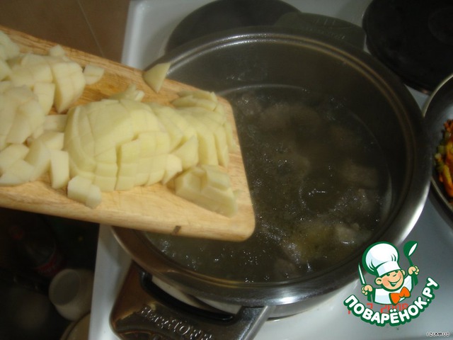 Добавить в бульон с мясом нарезанный кубиками картофель.