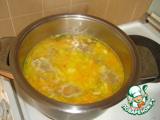 Hарезать кубиками мясо и сварить бульон с мясом.