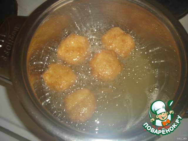 Cырные лепёшечки обжарили во фритюре до румяного цвета.