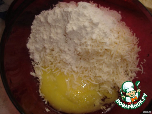 Tем временем, пока обжариваются овощи, трём на мелкой тёрке сыр, добавляем н него яйцо, муку и чеснок.