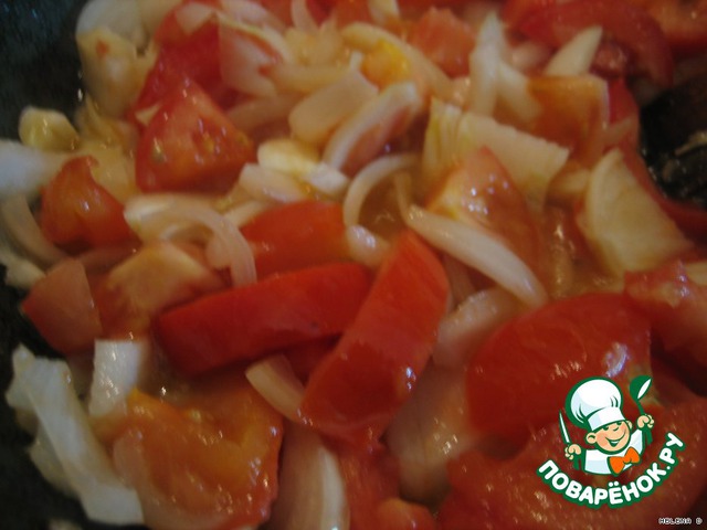 Сначала обжариваем помидоры с чесноком, потом добавляем морковь и вынимаем проваренное мясо(воду,где оно варилось сливаем).