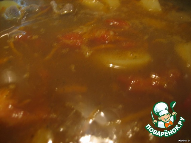 Добавляем всю зажарку + мясо и тушим ещё минут 15.
