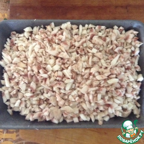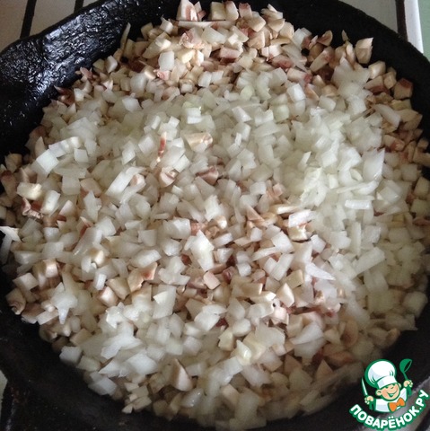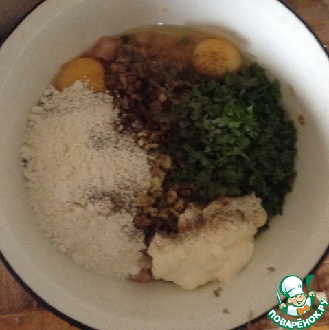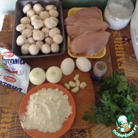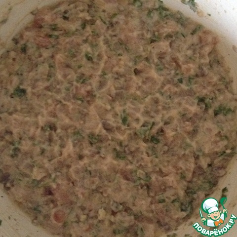 Смешиваем филе с луком и грибами, добавляем сметану, муку, зелень, яйца. Чеснок выдавливаем через чесночницу.