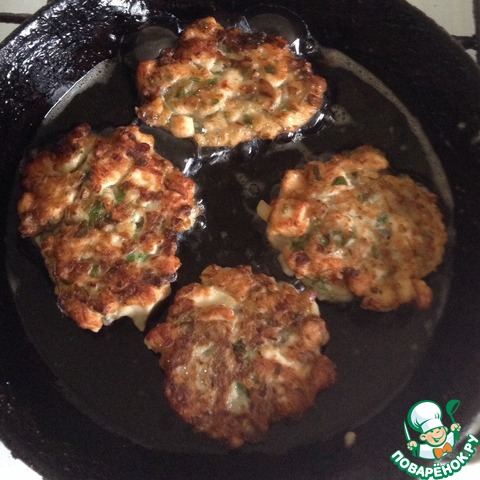 На сковородку наливаем подсолнечное масло. Нагреваем. Ложкой выкладываем фарш на сковородку. Обжариваем на среднем огне 3-5 минут с одной стороны, до появления золотистой корочки.