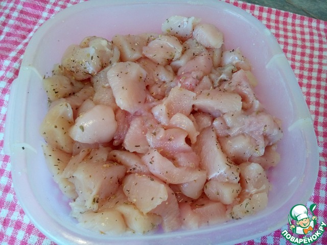 Куриное филе промойте, обсушите на бумажных полотенцах, очистите от пленок и нарежьте небольшими кусочками. Выложите мясо в глубокую емкость, посолите, поперчите, добавьте прованские травы, перемешайте и уберите мариноваться в холодильник на 1–2 часа.